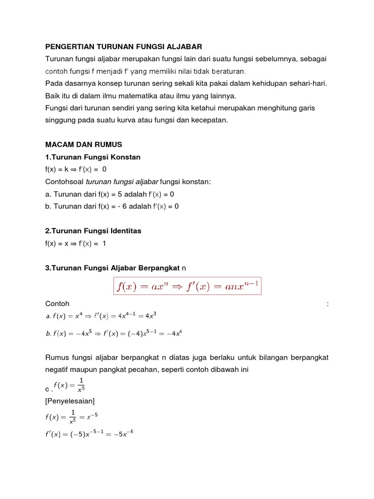 Diposkan oleh rully on monday, february 17, 2014. Coba kamu perhatikan grafik fungsi di bawah ini. Jika limit ini memang ada, dikatakan bahwa f terdiferensial di c. Turunan fungsi aljabar merupakan fungsi lain dari suatu fungsi sebelumnya, sebagai contoh fungsi f menjadi f' yang memiliki nilai tidak beraturan. Postingan ini membahas contoh soal turunan perkalian dan turunan pembagian yang disertai penyelesaiannya atau pembahasannya.